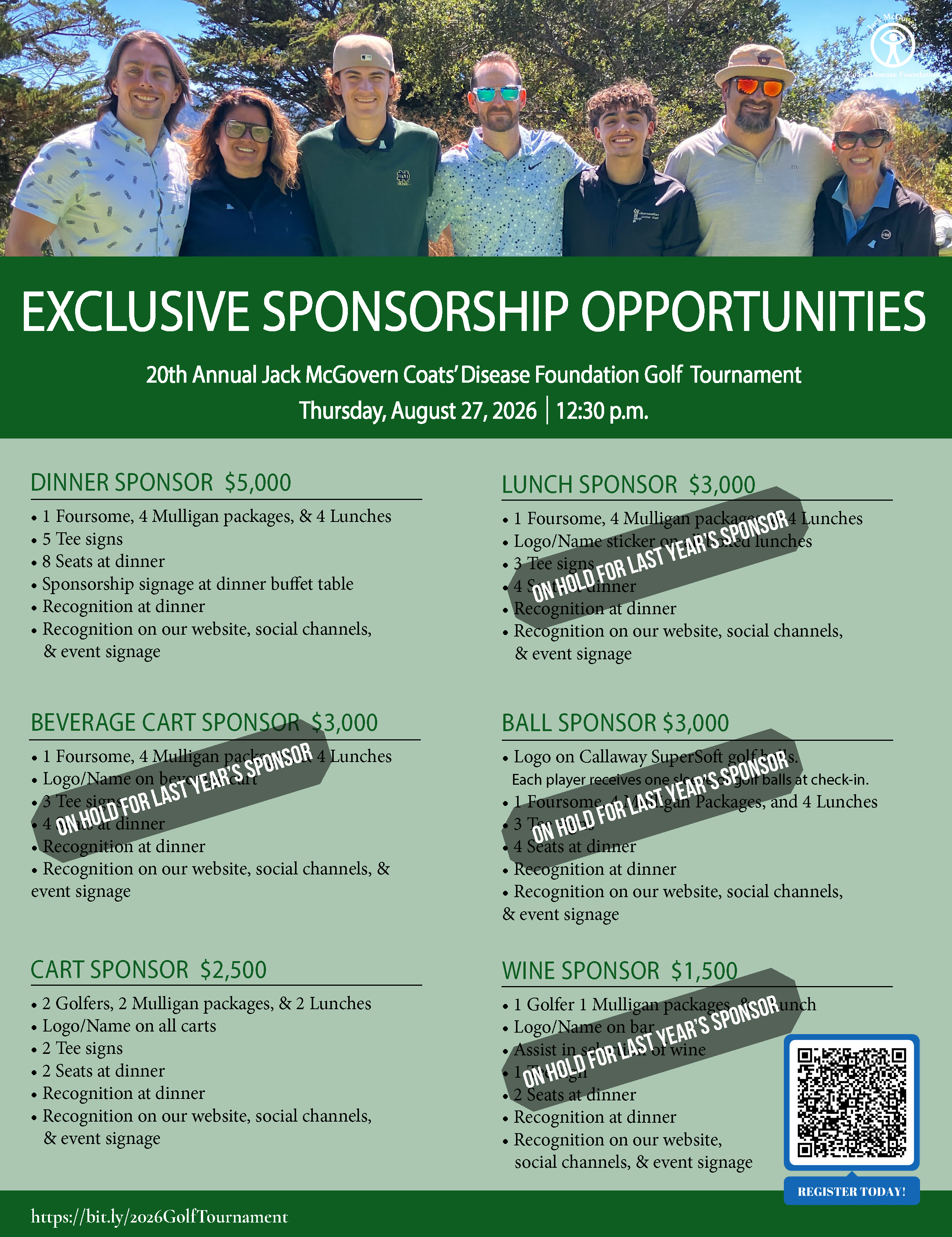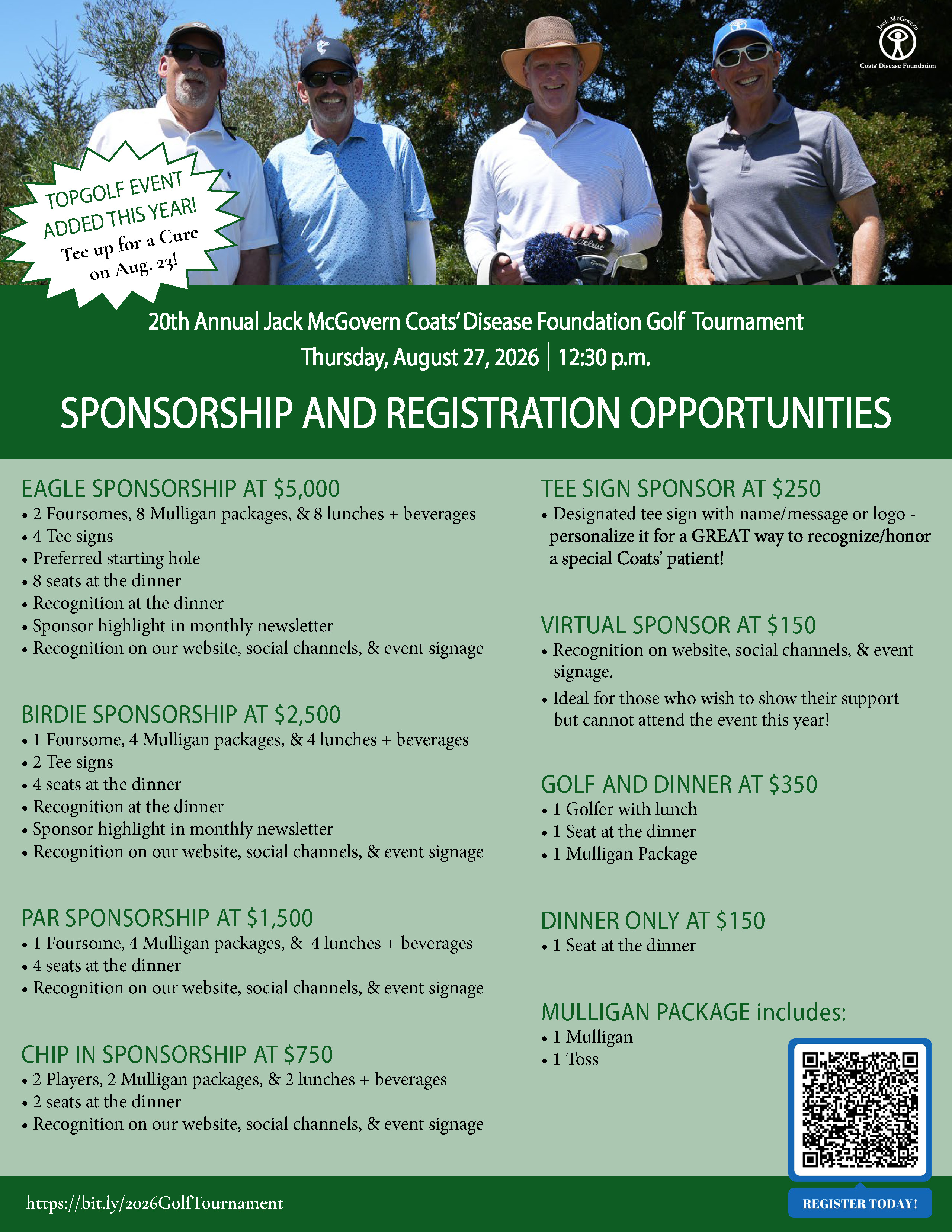 The 20th Annual Jack McGovern Coats' Disease Foundation Golf Tournament will be held on Thursday, August 27, 2026. Shotgun start will start promptly at 12:30 p.m., with check-in opening at 10:30 a.m.